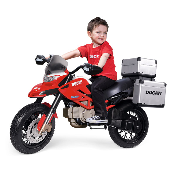 Motorić na akumulator jačine 12V Peg Perego Ducati Enduro pogodan za igru znalaca vožnje motocikla, ali ima mogućnost montiranja pomoćnih kotača za dodatnu sigurnost.